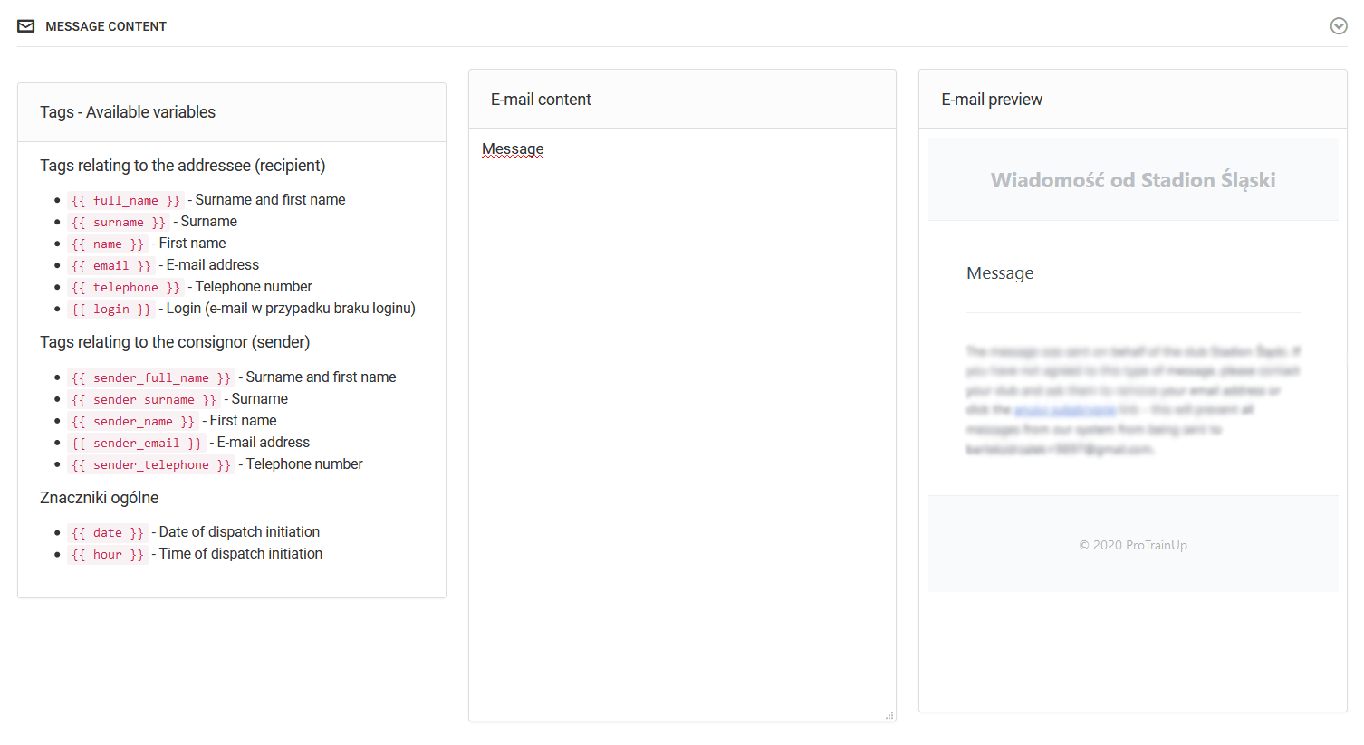 Before sending messages to recipients, pay attention to the possibility of using filters. You have three levels of filtering available: full - you will receive one message, even if you have many roles in the club (parent of several children), intelligent - you will skip duplicates of people who have similar roles e.g. The user will not miss duplicates of recipients such as a parent with two children, no filtering - one person can get a similar or the same message more than once if he plays several different roles in the club.