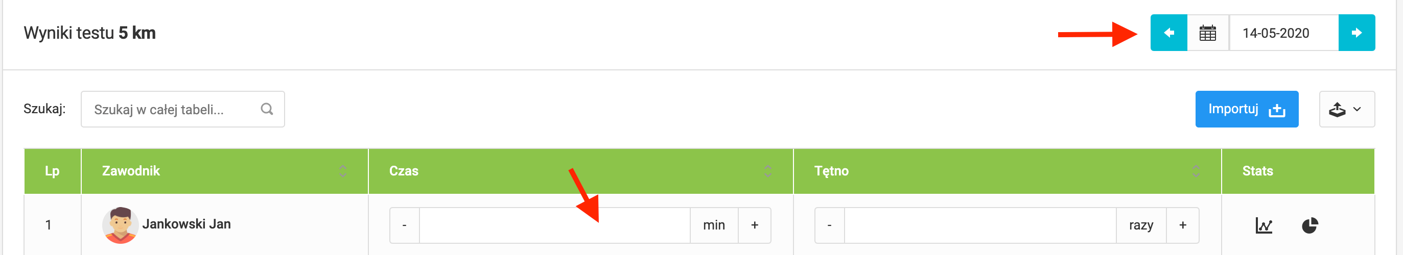 Aby rozpocząć uzupełnianie wyników musisz kliknąć „dostępne testy” w lewym menu. Po kliknięciu przeniesiesz się do listy testów. Znajdziesz tam swoje testy oraz kilka podstawowych testów przygotowanych przez nas. Będą to między innymi bieg na 5m, bieg na 20m, bieg na 30m oraz beep test. Po kliknięciu w dany test otworzy Ci się lista zawodników biorących udział w teście. Jeżeli w bieżącym dniu nie było żadnych testów, przy zawodnikach zobaczysz puste pola z miejscem na wpisanie wyników testu. Chcąc zmienić datę przeprowadzenia testu, kliknij w pole z datą w prawym górnym rogu okna.